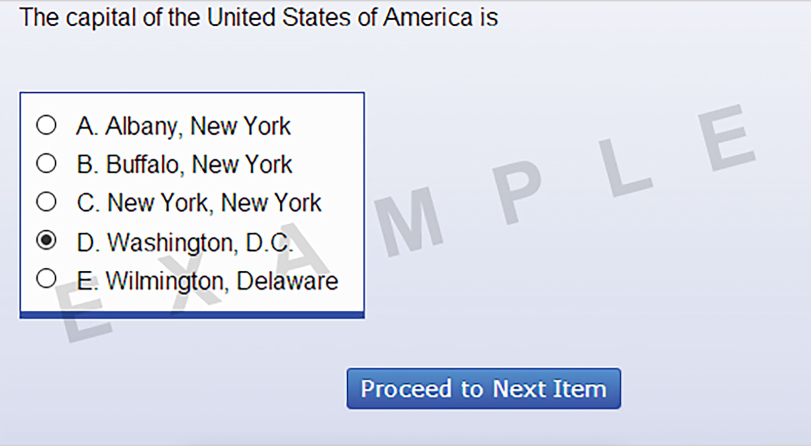 When you open a test block, each answerable item in the block will be preceded by a black bullet on the navigation bar, indicating that the item has not yet been answered. When you select an answer for an item, the black bullet will disappear. You may answer items using the mouse or keyboard. To use the mouse, point to the circle next to the desired response and click the left mouse button. A black dot inside the circle indicates that the answer has been selected. To use the keyboard, press the letter that corresponds to the desired response on the keyboard.