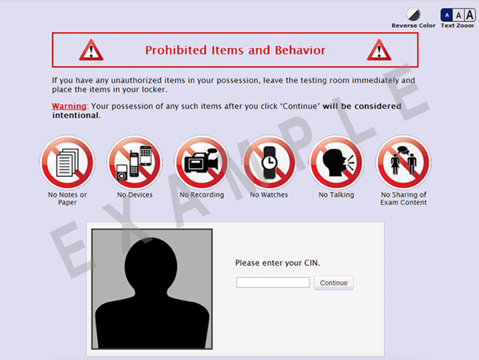 To reenter your examination following an unauthorized break, click the Return to Exam button. To reenter your examination after an authorized break, click the Start Next Block button. To unlock and resume the examination, enter your CIN in the space provided and then click the Continue button.