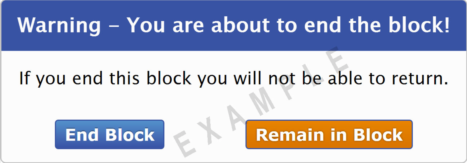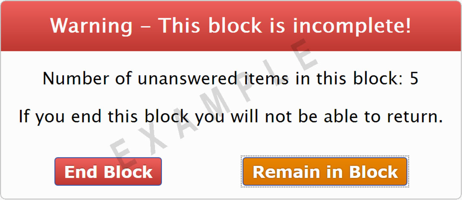If you have completed all items in a block, the red End Block button on the toolbar at the bottom of the screen changes to a green arrow. At this point, you may review your answers or return to marked items by clicking the sequence numbers on the navigation bar. If you would like to exit a block before the allotted time has run out, click the End Block button. One of the two warnings shown will appear. To return to the test and complete the items, click the Remain in Block button. To exit the block, click the End Block button. Once you have exited a block, you will NOT be able to go back and review these items or your responses to them.