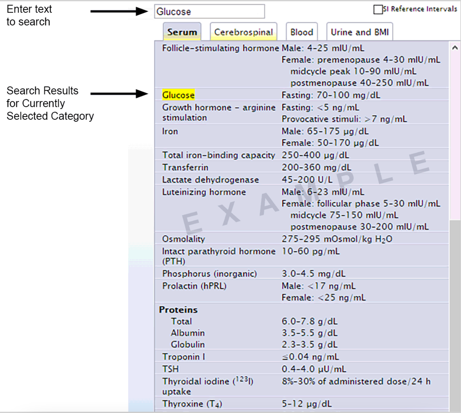 To search for a specific laboratory value, use the keyboard to enter the desired text. Search results will be highlighted within the current category, and additional category tabs with results will be highlighted. To search again, type over the existing text to obtain new results. To close the laboratory values, click the Lab Values button or Escape.